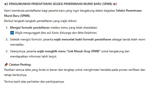PENGUMUMAN PENDAFTARAN SELEKSI PENERIMAAN MURID BARU (SPMB) 📢
